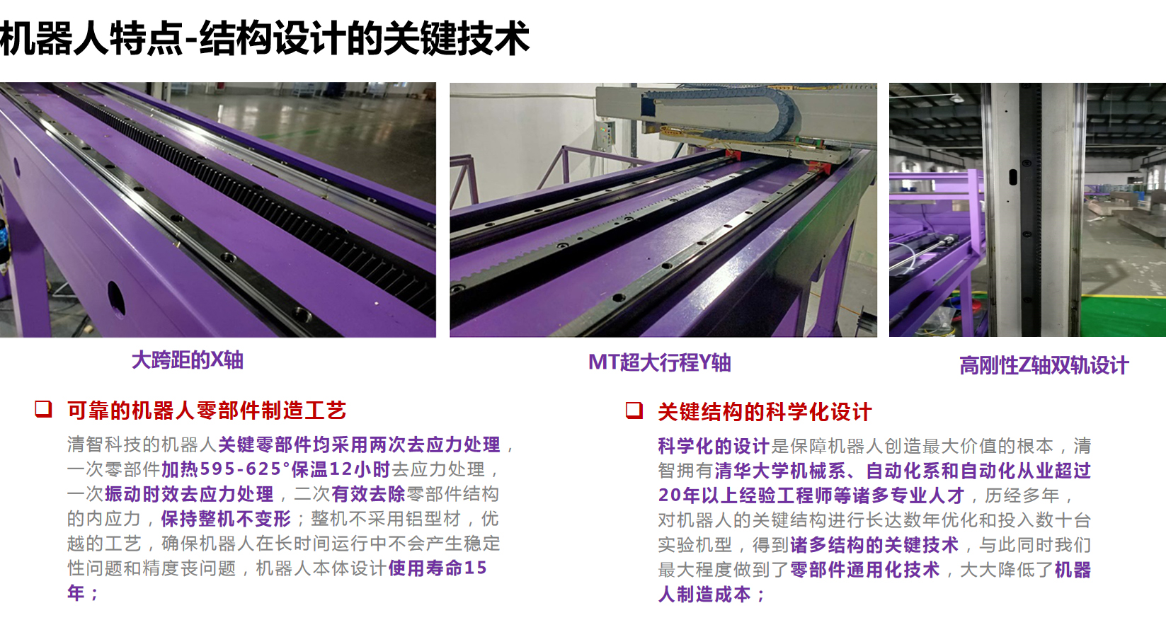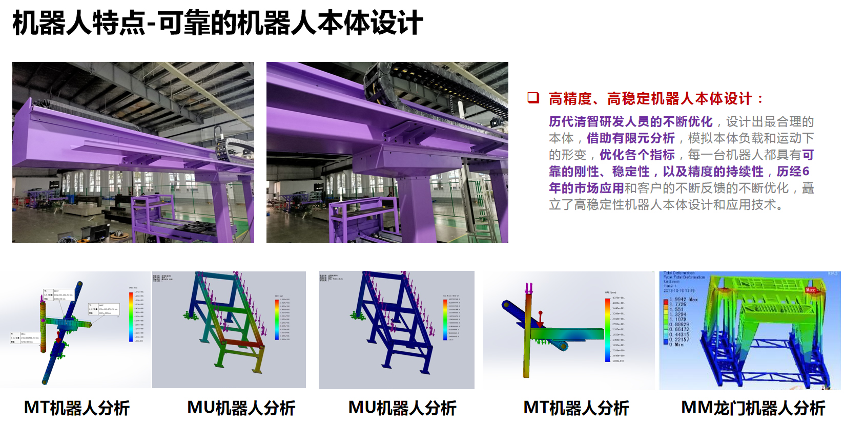 3、高穩定性:清華大學團隊歷經7年研發和市場應用,機身設計通過了數學建模、FEA、FDS等科學化的分析和優化,累積了成熟的研發技術和應用技術,機器人制造均采用標準化和批量化制造,工藝化裝配,嚴格的出廠檢驗標準,成就高穩定性的機加工產線,滿足全年24*365天的穩定運行;