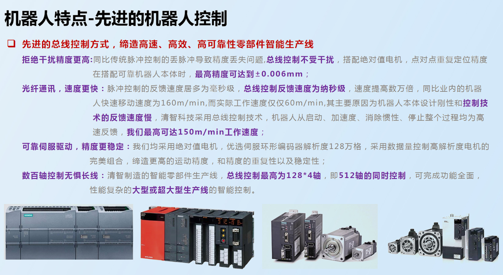 6、高精度:全系采用清智智能系統控制,采用NEX總線控制技術、閉環數字控制、搭配絕對值伺服電機解析度超過128萬格、采用光纖通訊技術,反饋速度更快、控制運算速度更快、搭配運動差補,整線實現重復點對點精度0.015mm